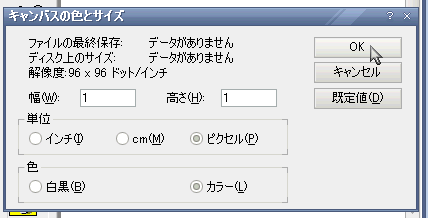 幅と高さは1に。単位はピクセル。色はカラーです。